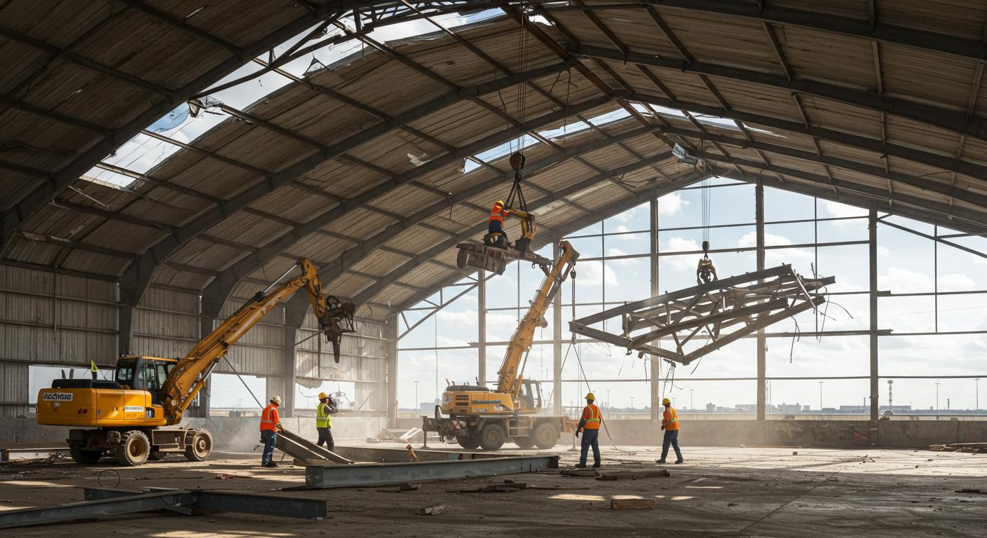 Первый этап демонтажа — детальная оценка состояния ангара и подготовка площадки для безопасной работы. Необходимо проверить конструкцию на наличие коррозии, повреждений, трещин, а также определить, какие элементы можно сохранить. Анализ включает изучение каркасов, стропильных систем, балок и соединительных деталей, что позволяет составить точный план разборки. Важно также учитывать расположение других объектов на территории, наличие коммуникаций и возможные риски для работников. Подготовка территории включает ограждение рабочих зон, маркировку опасных участков и создание временных складов для хранения деталей.