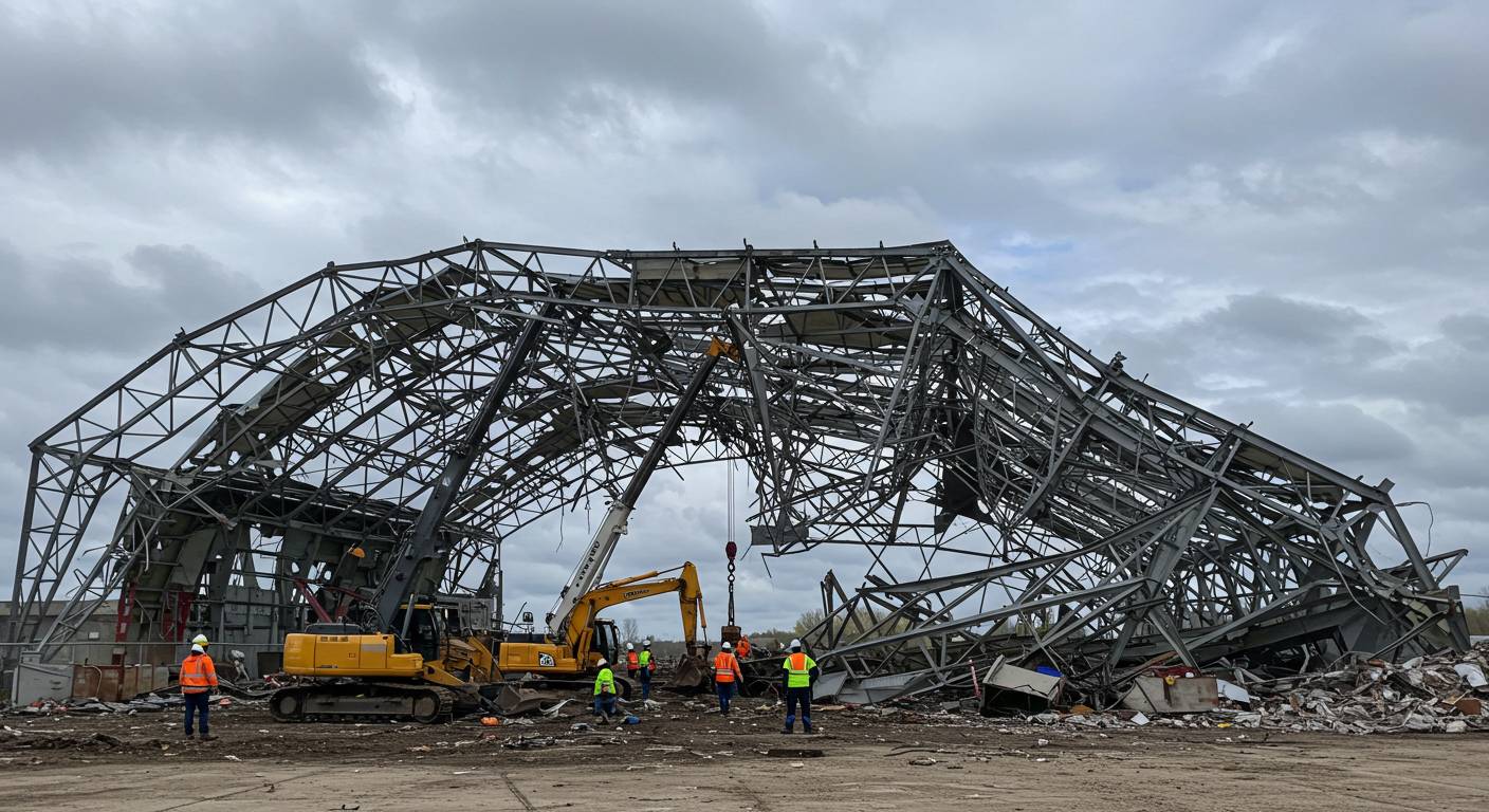 Фото: демонтаж ангара с повреждёнными элементами и подготовка материалов к переработке