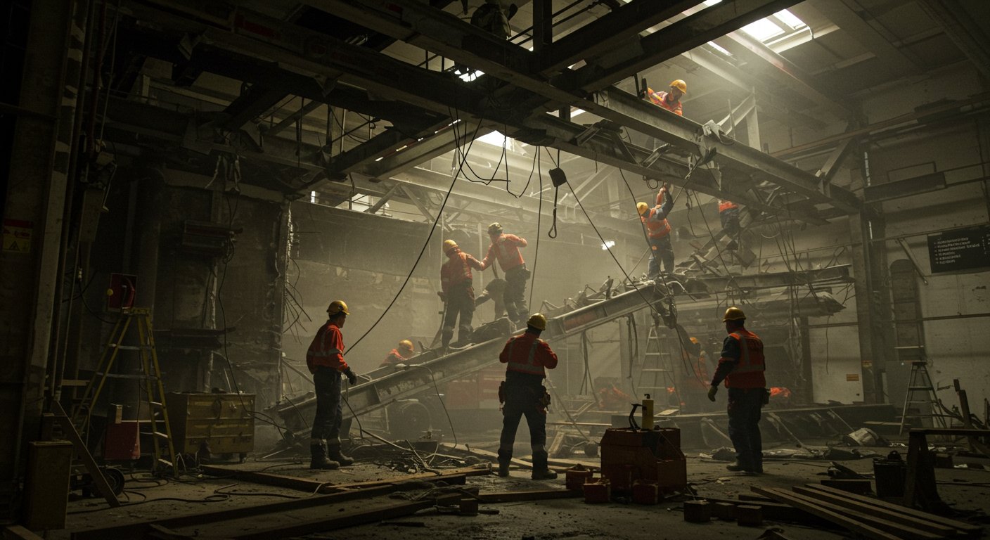 Подпись: Специалисты аккуратно разбирают ангар, используя компактную технику и ручные инструменты для безопасного демонтажа в стеснённых условиях.