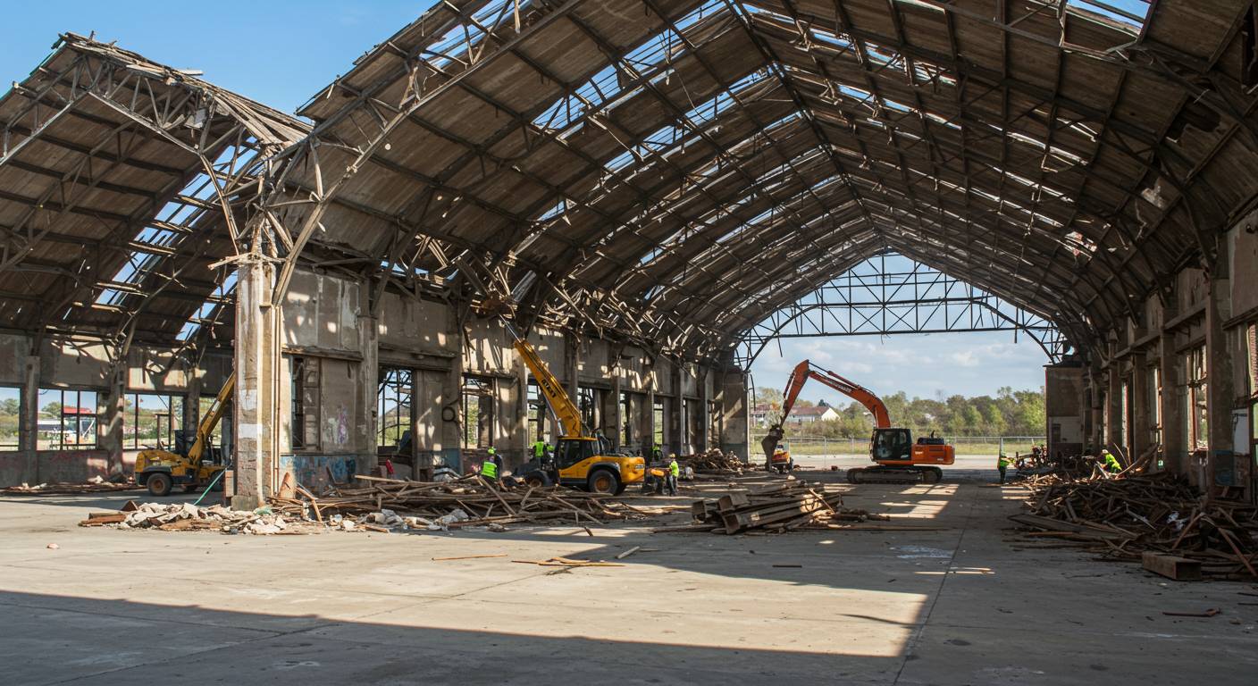 Подпись: Организованный демонтаж с использованием техники и планирования позволяет безопасно разобрать двускатный ангар и сохранить материалы.