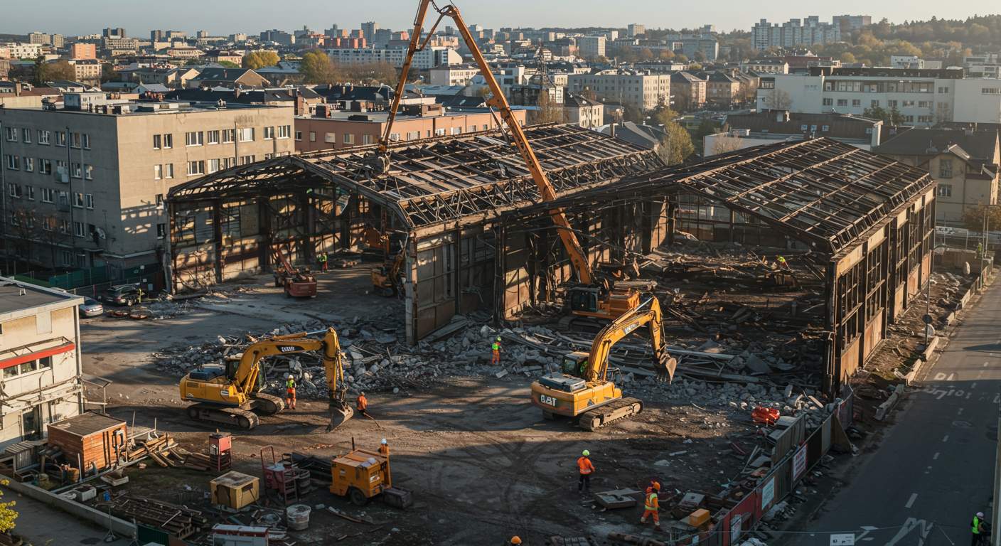 Процесс демонтажа ангаров в городской среде включает несколько тщательно продуманных этапов, каждый из которых влияет на безопасность и эффективность работ. Сначала проводится детальное обследование конструкции, включая визуальную инспекцию и оценку состояния металлоконструкций, фундамента и кровли. На основе этой информации создается поэтапный план демонтажа, включающий методы разборки и последовательность удаления конструктивных элементов. Подготовительный этап также включает расчистку территории, ограждение зоны работ, установку временных дорожек для техники и обеспечение доступа к точкам погрузки материалов.