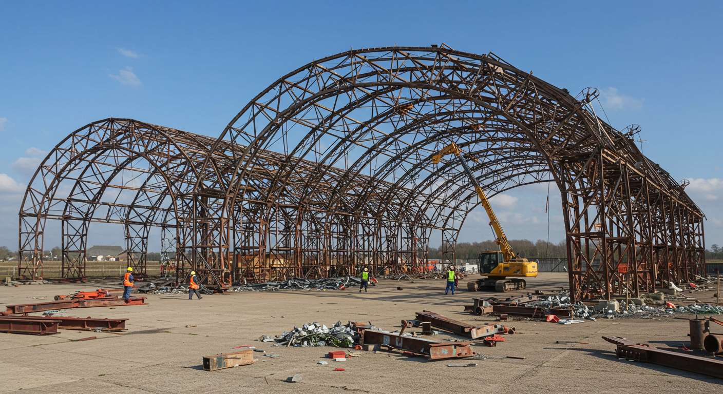Демонтаж старых арочных ангаров выполняется с использованием комбинации ручных и механизированных методов. Основные подходы: