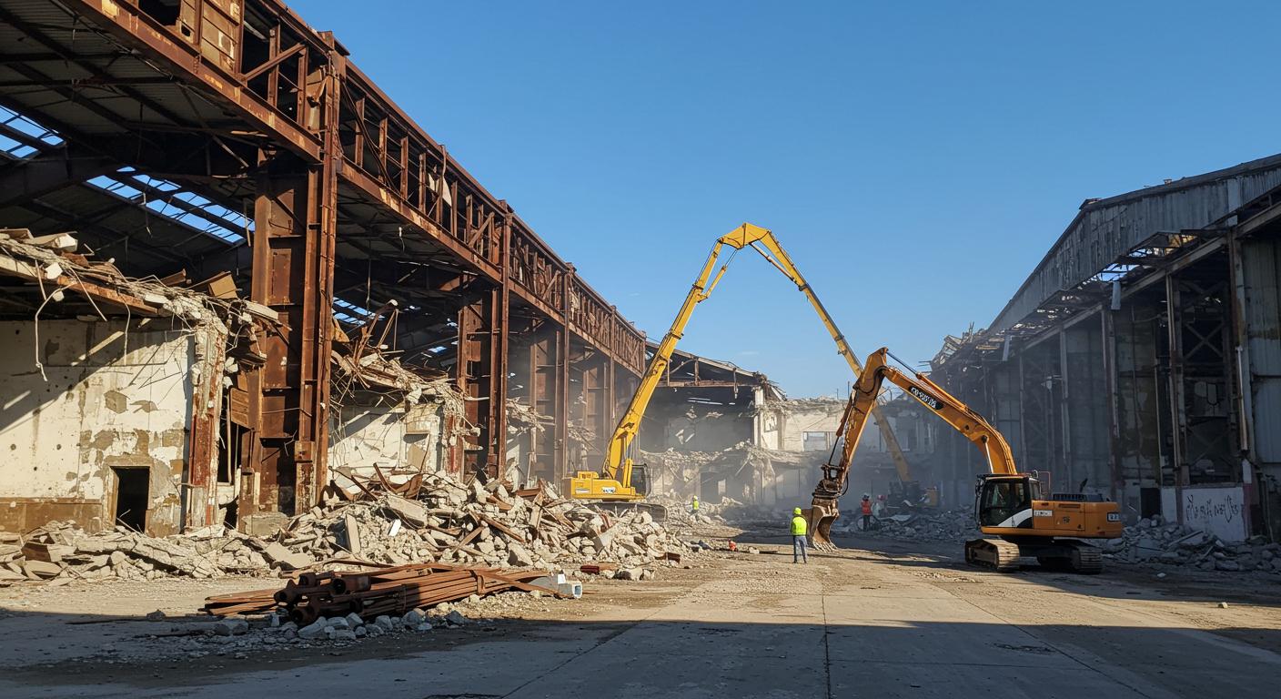 Фото: процесс демонтажа старого склада с использованием спецтехники