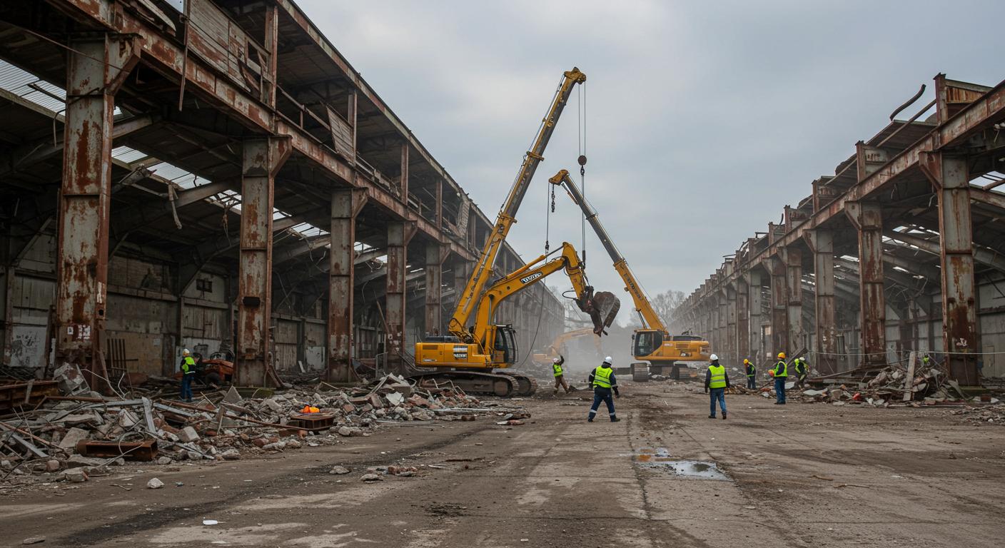 На фото: демонтаж старого складского ангара с применением специализированной техники и соблюдением мер безопасности.